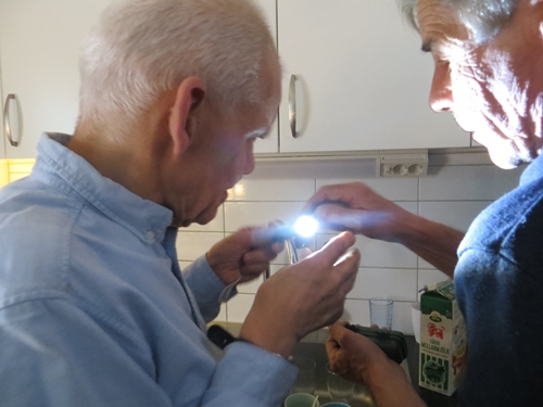Hemma väntade Ingemar med fika, sedan blev det dusch och uppackning. Vid 16 tiden bar det iväg igen, men den här gången upp till lillebror Michael, som fyllde 64 år. Kurre och jag hade ju köpt ficklampa och klocka till honom på marknaden och nu skulle ficklampan testas, klockan åkte på direkt.